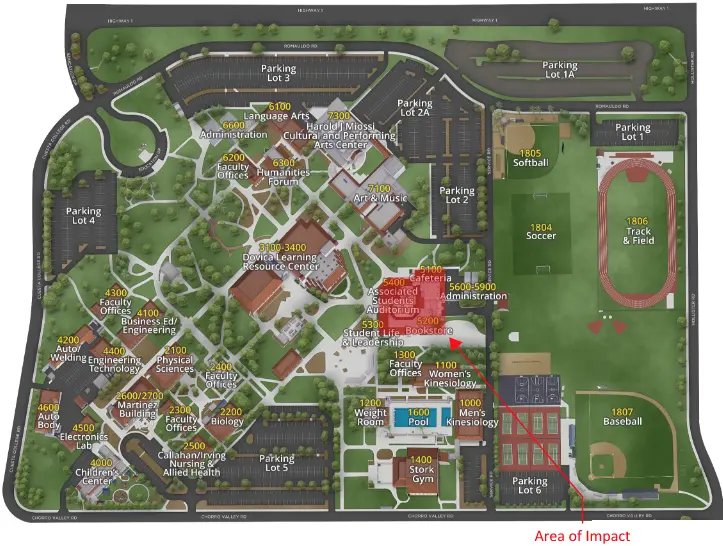 Description: A water leak was discovered in Building 1400. All water service has been shut off to the building. At this time, it is unknown when water service will be restored. Please use the facilities in Buildings 1000 and 1100. The area of impact is noted on the associated map.
