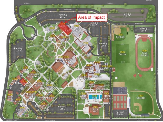 Description: The women’s locker room in building 1100 will be closed for a drainpipe repair. During this time, Community Programs and Athletics will need to use the facilities in rooms 1019, 1022, and 1026. The area of impact is noted on the associated map. Noise is to be expected.