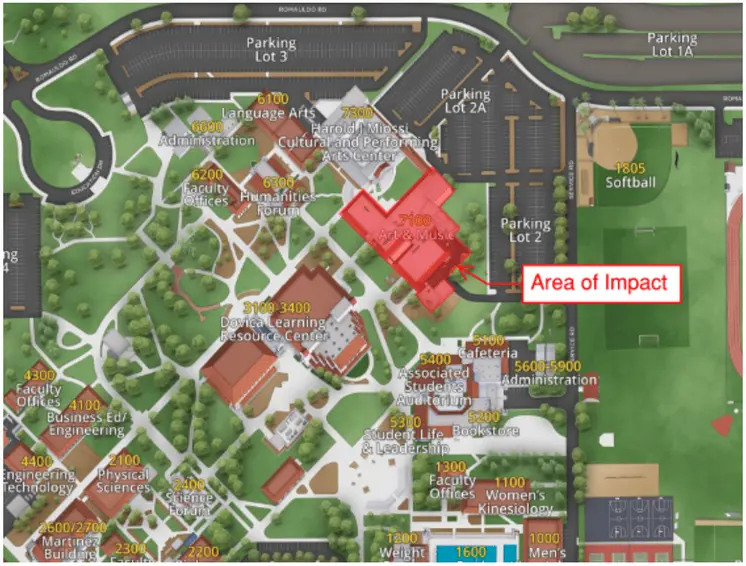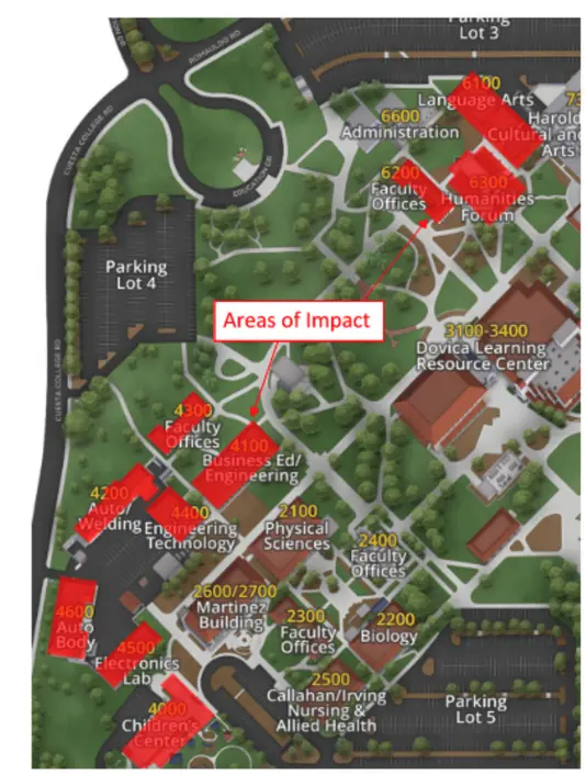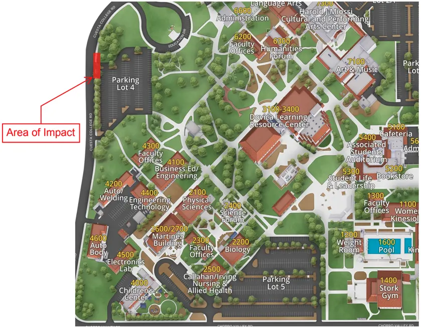 Description: Contractor will close a portion of the sidewalk adjacent to Parking Lot 4. Pedestrians are encouraged to find alternate walking routes to avoid stepping into Cuesta College Road traffic. Noise is expected. The areas of impact are noted on the associated map.