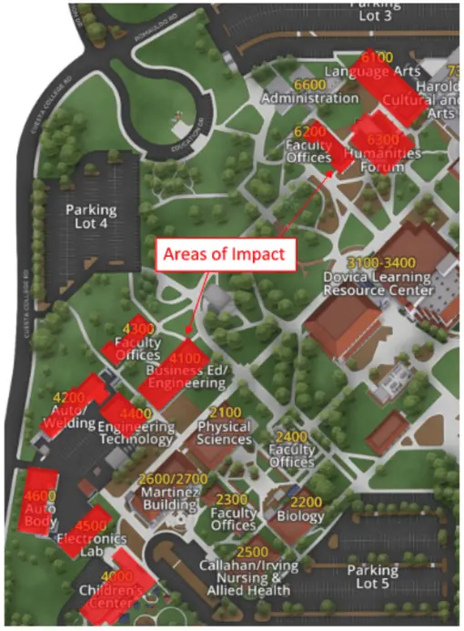 Description: The contractor will be performing underground electrical work to connect the campus’s main electrical feed loop to the new instructional building. As a result, electrical power to Buildings N1000/N1100 and N2400 will be shut off for the duration of the work. Please refer to the associated map for details on the areas impacted.