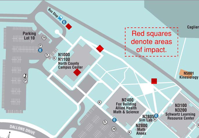 Description: Contractor will be re-establishing power to the Parking Lot 5 kiosk. Work will include sawcutting and patch back of approx. 40 feet of asphalt walkway. Area of impact is noted below. Please be advised that noise is to be expected.
